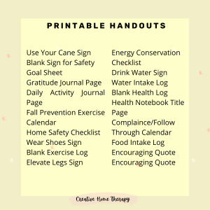68 page E book with 37 senior care printable health organization and encouragement handouts, plus practical tips, and evidence based health information!
