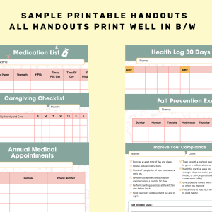1 pdf file includes 37 Handouts developed by clinicians for senior caregiving. Print well in B/W, colors may vary per printer.