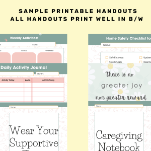 1 pdf file includes 37 Handouts developed by clinicians for senior caregiving. Print well in B/W, colors may vary per printer.